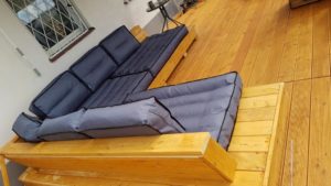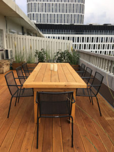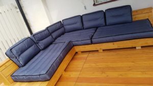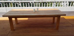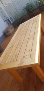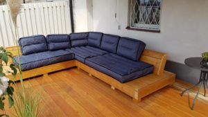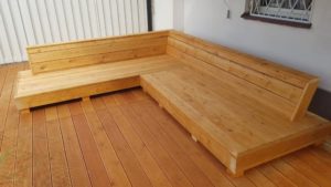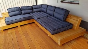 Meble wypoczynkowe: narożnik oraz stół z drewna świerkowego oraz modrzewia syberyjskiego.