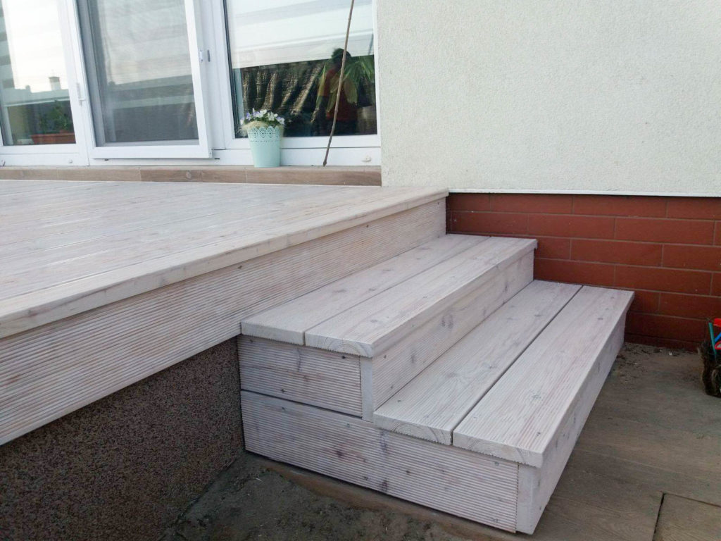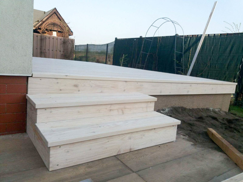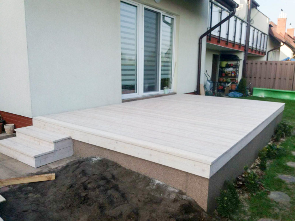 Taras wykonany z desek modrzewia syberyjskiego malowany na kolor biały