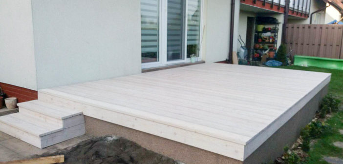 Taras wykonany z desek modrzewia syberyjskiego malowany na kolor biały