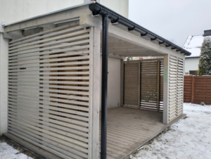 Poniżej realizacja na pergolę tarasową z drewna BSH/KVH z impregnacją w kolorze srebrno szarym oraz deska kompozytowa GARDIN NATUR Srebrna Jodła – wyszło super ( choć zdjęcia prosto z dnia roboczego)