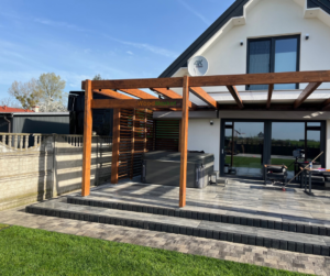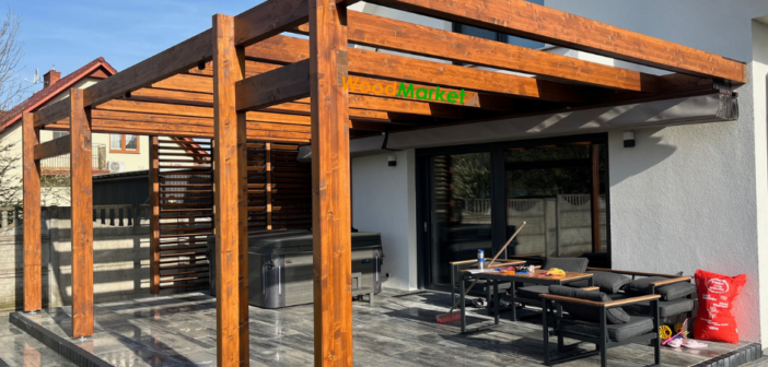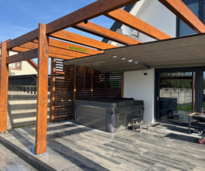 Pergola tarasowa wykonana z drewna konstrukcyjnego KVH / BSH – zaimpregnowana HK Lasur w wybranym przez klienta kolorze oraz roleta materiałowa pełniąca funckję ochrony przed słońcem i deszczem.