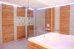 „Deski sosnowe i świerkowe w wyniku termowania zyskują piękną ciepłą barwę, która wprowadza przyjazny klimat i wygląd premium. Znakomicie współgra z nowoczesnymi pomysłami na aranżację przestrzeni, które są charakterystyczne dla stref wellness i spa w luksusowych hotelach. Drewno jest też dobrym izolatorem akustycznym, więc oprócz ciepła — zyskujemy spokój. Termodrewno może być bez obaw stosowane w wilgotnym otoczeniu, czyli właśnie saunie, łazience lub nad basenem. Nie paczy się, nie gnije, ale też nie parzy. Potwierdzają to badania prowadzone w fińskich łaźniach publicznych, gdzie termodrewno było poddawane nagrzewaniu po 10 godzin dziennie.” — kontynuuje Darina Lazarova z JAF Polska